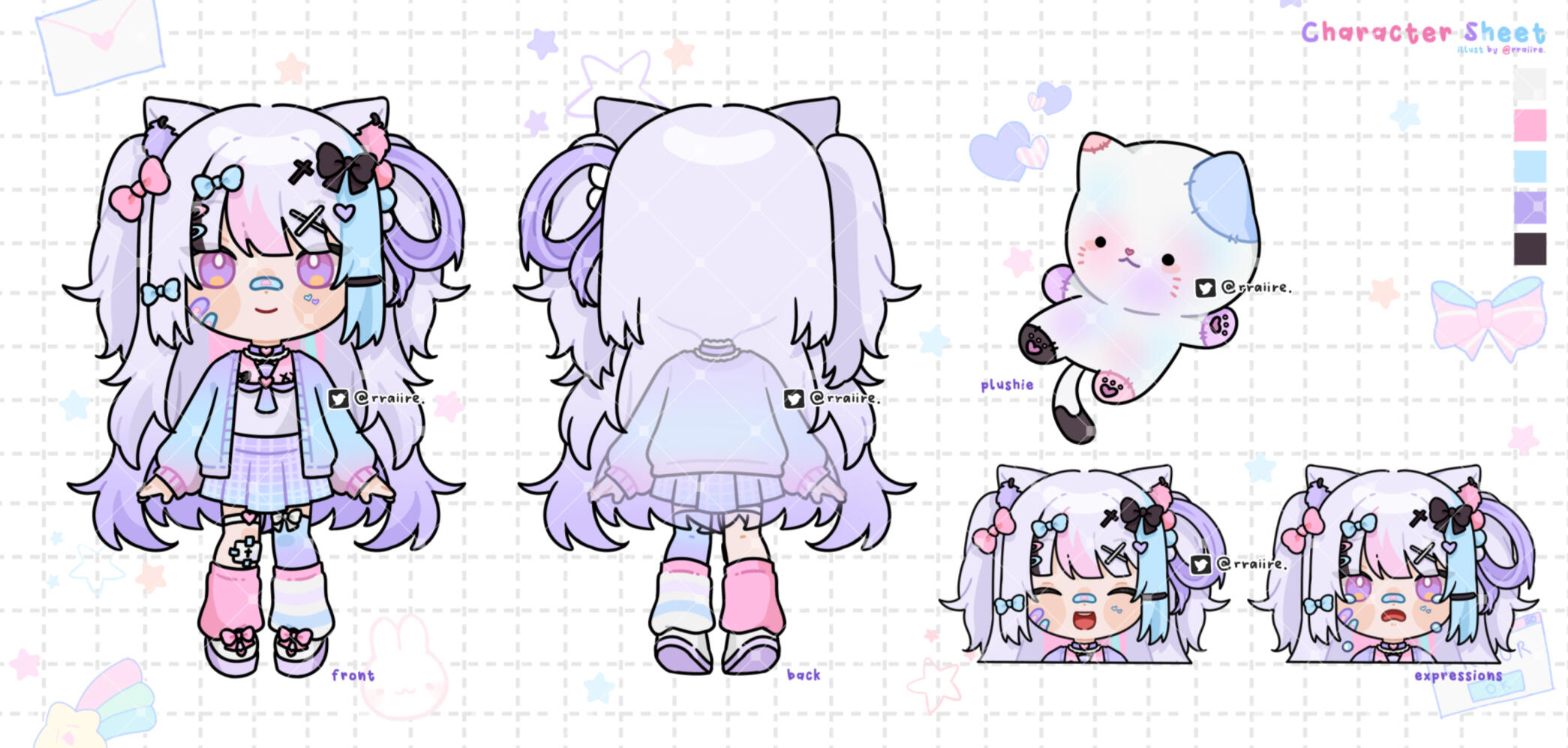Include▸ 1 Full-Body Front view(Fully Rendered) + Back view (Flat), 1 Full-Body Chibi/Smol Bean, Color Palette, 1-2 Props/Accesories & Sheet layout fitting to the design